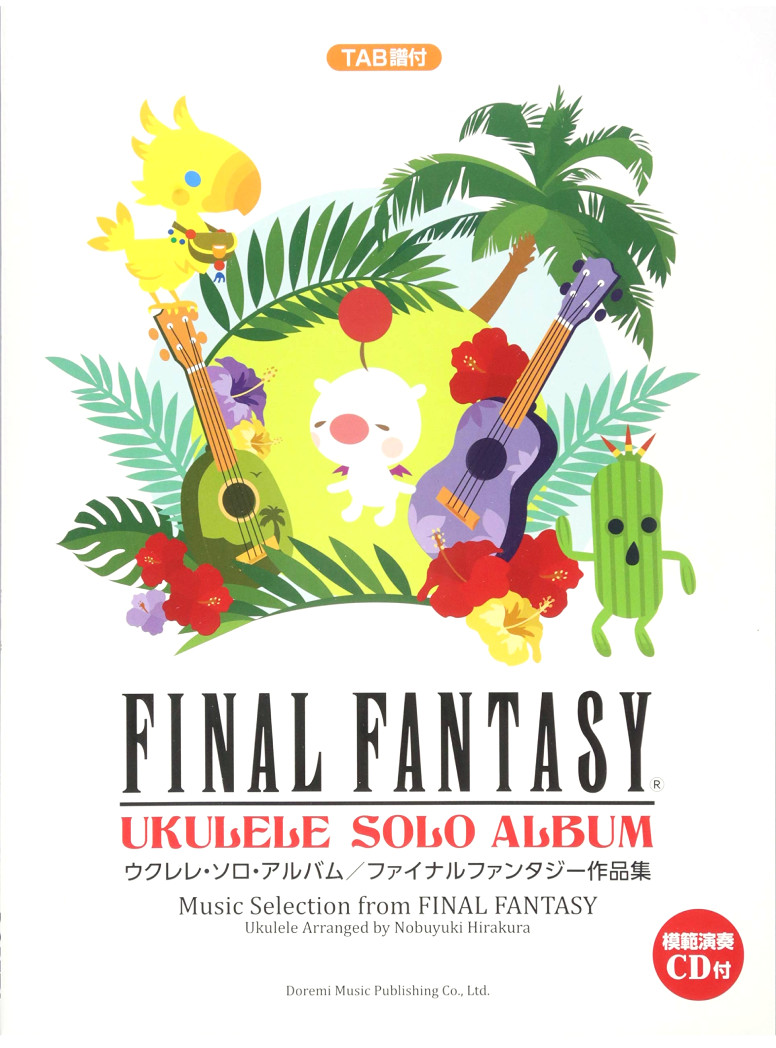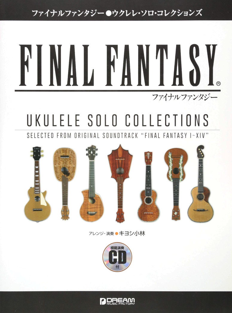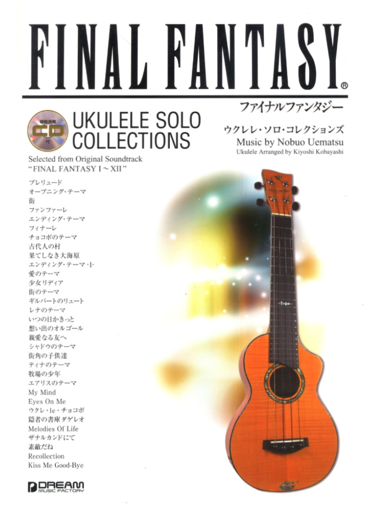 Dream Music Factory published the first ukulele book in 2008, the Final Fantasy Ukulele Solo Collections. It has 31 pieces from Final Fantasy I to XII. It got updated in 2014. This new edition has 37 pieces from Final Fantasy I to XIV. Both editions are arranged by Kiyoshi Kobayashi (キヨシ小林). Also in 2014, Doremi published the Final Fantasy Ukulele Solo Album arranged by Nobuyuki Hirakura (平倉信行). The same guy who arranged the Final Fantasy Guitar Solo Collection.
