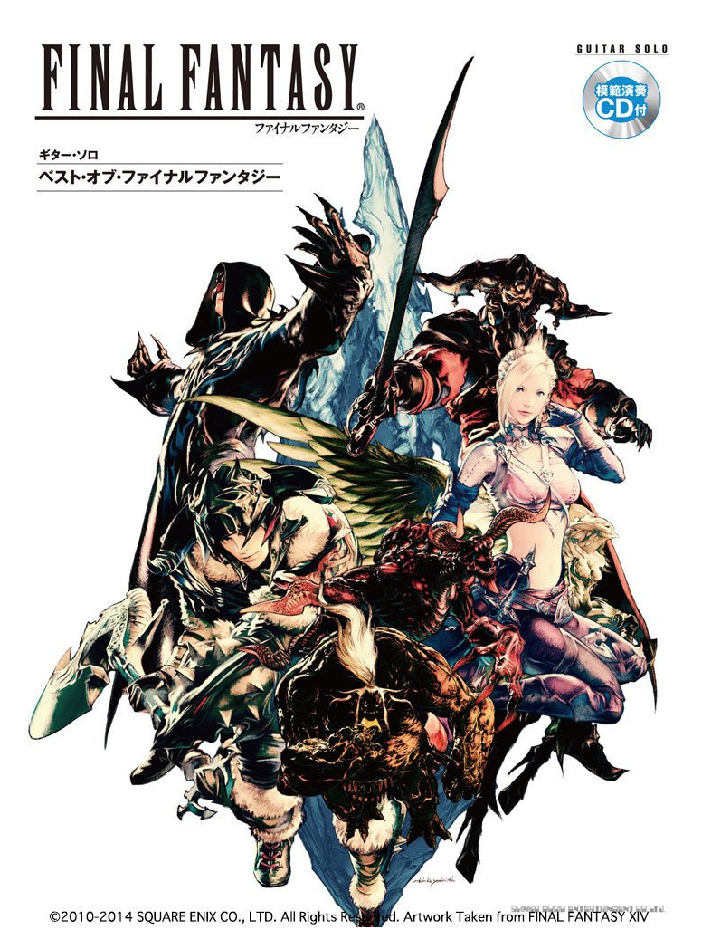The Guitar Solo Best of Final Fantasy was published by Shinko Music Entertainment in 2010 and it’s arranged by Yuji Toriyama (鳥山雄司). It has 25 pieces from Final Fantasy I to XIII. Got updated in 2014, this time arranged by Makoto Hongo (北郷真). It has 27 pieces from Final Fantasy I to XIV. While most of the pieces remained the same between editions, some got removed and new ones were added.